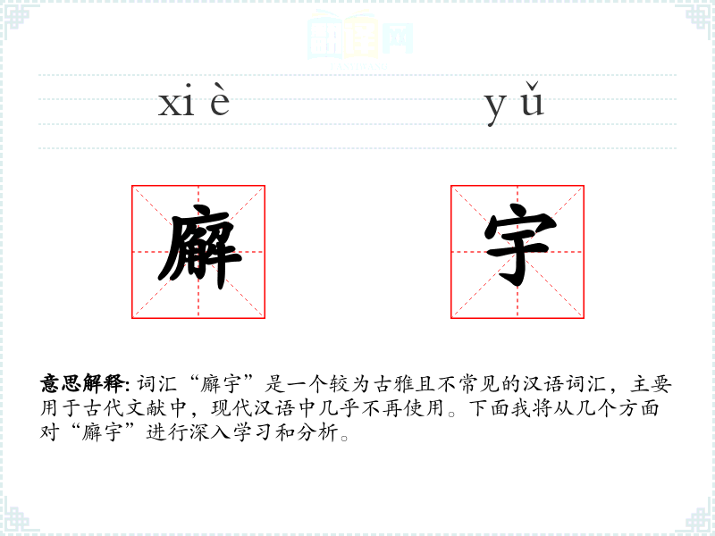 词汇“廨宇”是一个较为古雅且不常见的汉语词汇,主要用于古代文献中,现代汉语中几乎不再使用。下面我将从几个方面对“廨宇”进行深入学*和分析。