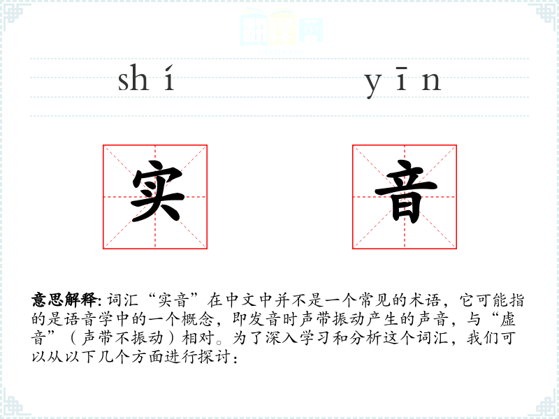 “实音”在语音学中通常指的是声带振动产生的声音,即浊音。与之相对的是“虚音”或清音,即声带不振动产生的声音。