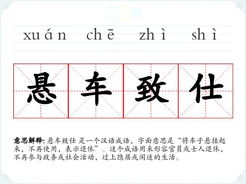 悬车致仕 是一个汉语成语,字面意思是“将车子悬挂起来,不再使用,表示退休”。这个成语用来形容官员或士人退休,不再参与政务或社会活动,过上隐居或闲适的生活。
