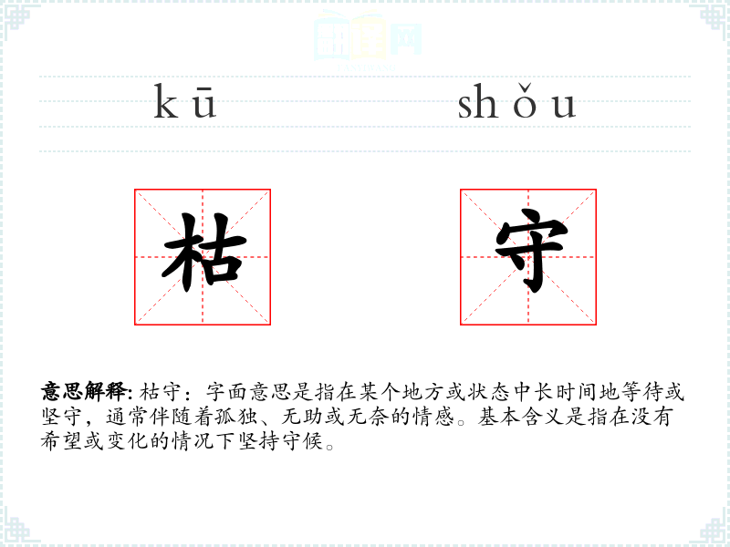 枯守:字面意思是指在某个地方或状态中长时间地等待或坚守,通常伴随着孤独、无助或无奈的情感。基本含义是指在没有希望或变化的情况下坚持守候。
