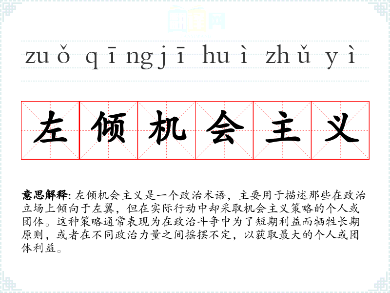 左倾机会主义是一个政治术语,主要用于描述那些在政治立场上倾向于左翼,但在实际行动中却采取机会主义策略的个人或团体。这种策略通常表现为在政治斗争中为了短期利益而牺牲长期原则,或者在不同政治力量之间摇摆不定,以获取最大的个人或团体利益。