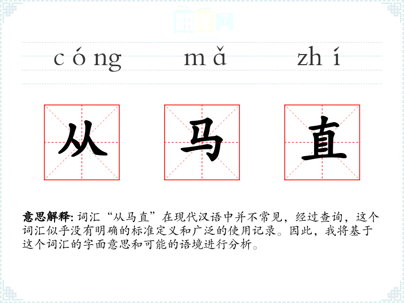 “从马直”字面意思可能是指“跟随马匹直接前行”,其中“从”表示跟随,“马”指马匹,“直”表示直接。然而,这个词汇在现代汉语中并不常用,可能是一个古语词汇或者特定领域的术语。