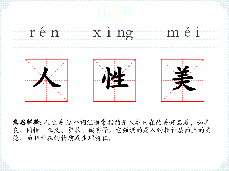 人性美 这个词汇通常指的是人类内在的美好品质,如善良、同情、正义、勇敢、诚实等。它强调的是人的精神层面上的美德,而非外在的物质或生理特征。
