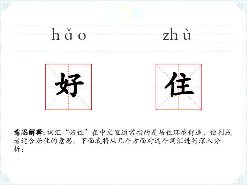 词汇“好住”在中文里通常指的是居住环境舒适、便利或者适合居住的意思。下面我将从几个方面对这个词汇进行深入分析: