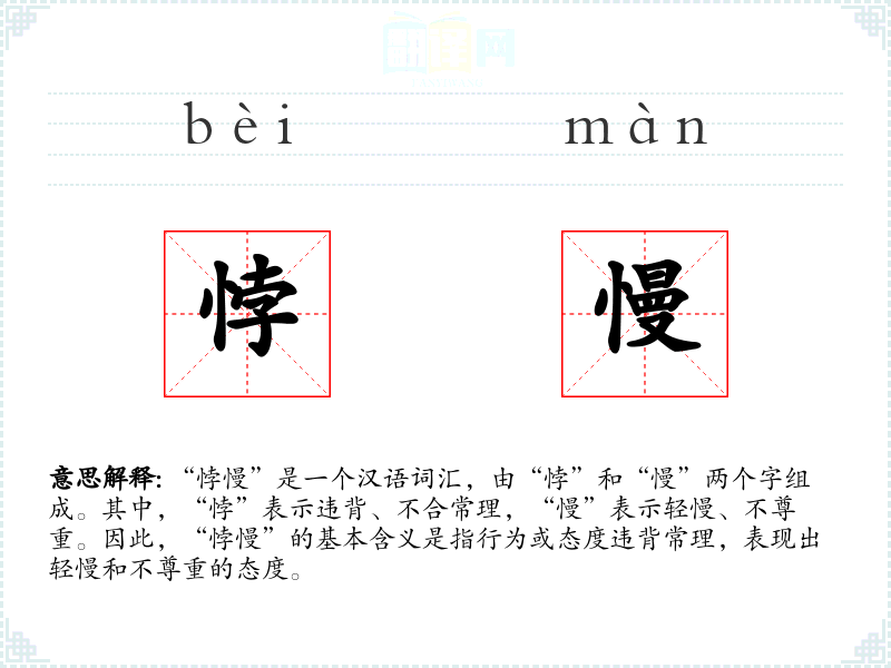 “悖慢”是一个汉语词汇,由“悖”和“慢”两个字组成。其中,“悖”表示违背、不合常理,“慢”表示轻慢、不尊重。因此,“悖慢”的基本含义是指行为或态度违背常理,表现出轻慢和不尊重的态度。