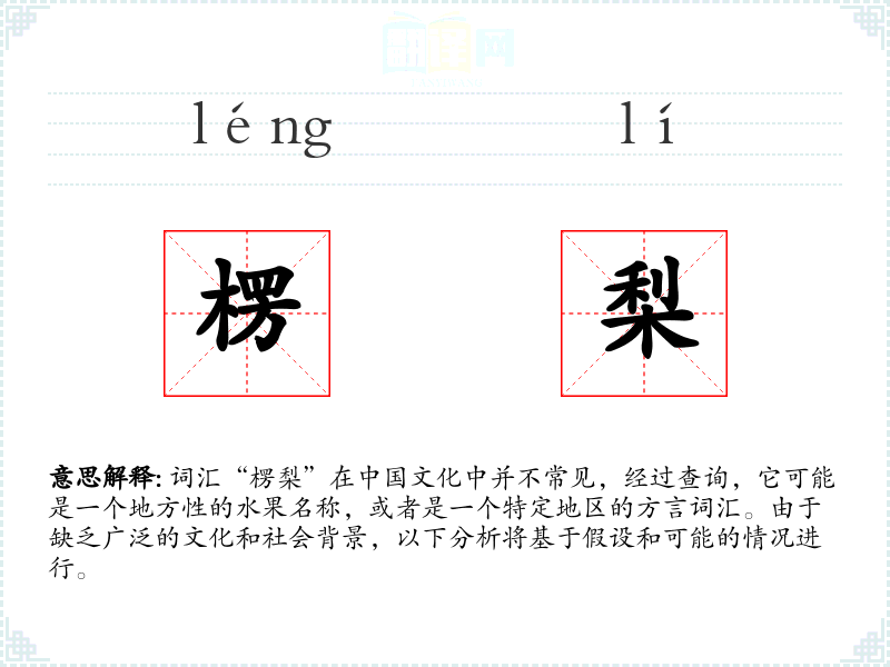 词汇“楞梨”在**文化中并不常见,经过查询,它可能是一个地方性的水果名称,或者是一个特定地区的方言词汇。由于缺乏广泛的文化和社会背景,以下分析将基于假设和可能的情况进行。
