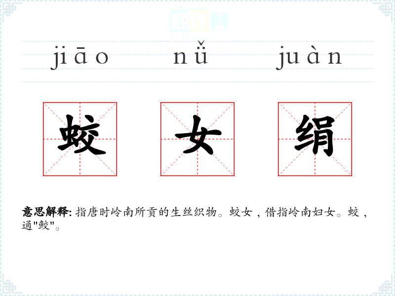 指唐时岭南所贡的生丝织物。蛟女﹐借指岭南妇女。蛟﹐通"鲛"。
