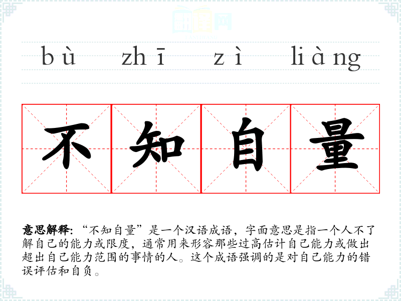 “不知自量”是一个汉语成语,字面意思是指一个人不了解自己的能力或限度,通常用来形容那些过高估计自己能力或做出超出自己能力范围的事情的人。这个成语强调的是对自己能力的错误评估和自负。