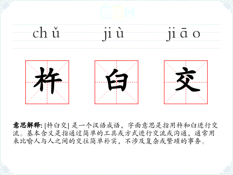 [杵臼交] 是一个汉语成语,字面意思是指用杵和臼进行交流。基本含义是指通过简单的工具或方式进行交流或沟通,通常用来比喻人与人之间的交往简单朴实,不涉及复杂或繁琐的事务。