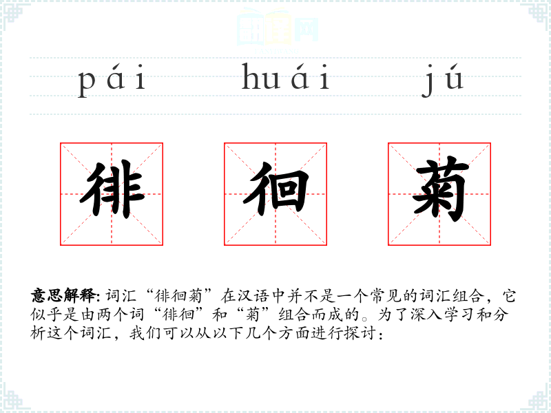 词汇“徘徊菊”在汉语中并不是一个常见的词汇组合,它似乎是由两个词“徘徊”和“菊”组合而成的。为了深入学*和分析这个词汇,我们可以从以下几个方面进行探讨:
