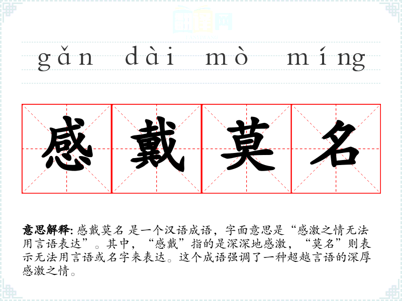 感戴莫名 是一个汉语成语,字面意思是“感激之情无法用言语表达”。其中,“感戴”指的是深深地感激,“莫名”则表示无法用言语或名字来表达。这个成语强调了一种超越言语的深厚感激之情。