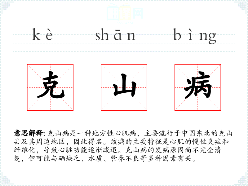 在医学专业领域,克山病是一个特定的疾病名称,用于描述一种特定的心肌病变。在文学或口语中,这个词汇可能不太常见,除非是在讨论健康、疾病或特定地理区域的问题时。