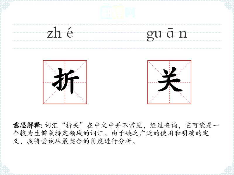 词汇“折关”在中文中并不常见,经过查询,它可能是一个较为生僻或特定领域的词汇。由于缺乏广泛的使用和明确的定义,我将尝试从最契合的角度进行分析。