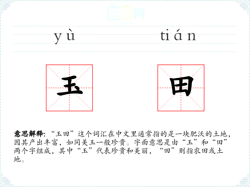 “玉田”这个词汇在中文里通常指的是一块肥沃的土地,因其产出丰富,如同美玉一般珍贵。字面意思是由“玉”和“田”两个字组成,其中“玉”代表珍贵和美丽,“田”则指农田或土地。