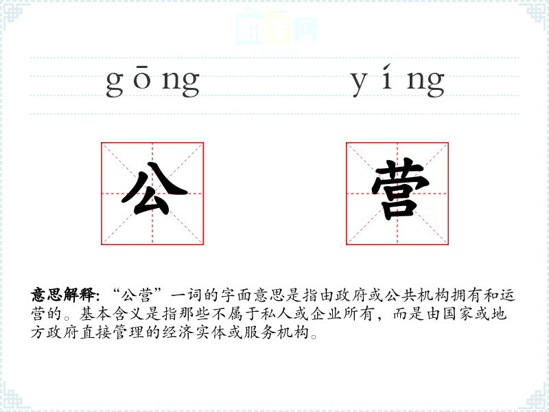 “公营”一词的字面意思是指由政府或公共机构拥有和运营的。基本含义是指那些不属于私人或企业所有,而是由国家或地方政府直接管理的经济实体或服务机构。