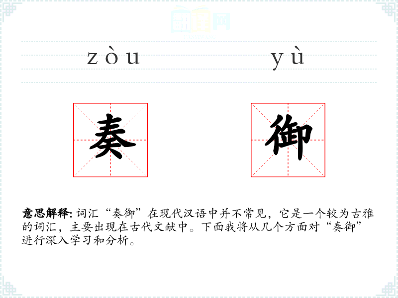在现代生活中,“奏御”一词几乎不再使用,但在学*古代历史或文学时,了解这一词汇有助于更好地理解古代政治制度和文化背景。