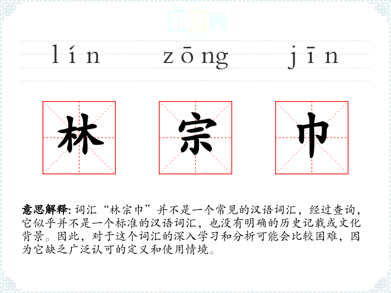 总结来说,“林宗巾”这个词汇在目前的汉语语境中并不具有明确的定义和广泛的使用,因此对其进行深入的学*和分析是有限的。如果你有更多的上下文信息或者是在特定的文献或文化背景中遇到这个词汇,请提供更多细节,以便进行更准确的分析。