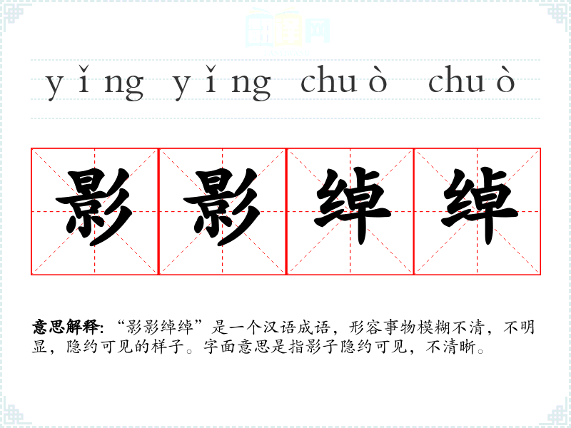 “影影绰绰”是一个汉语成语,形容事物模糊不清,不明显,隐约可见的样子。字面意思是指影子隐约可见,不清晰。