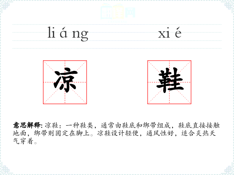 凉鞋:一种鞋类,通常由鞋底和绑带组成,鞋底直接接触地面,绑带则固定在脚上。凉鞋设计轻便,通风性好,适合炎热天气穿着。