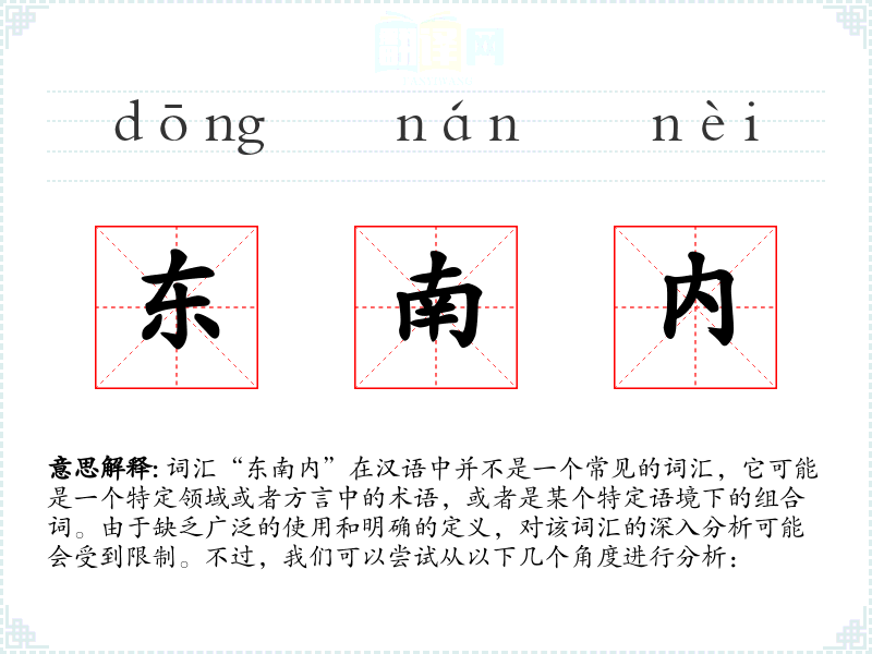 由于“东南内”不是一个标准词汇,我们无法给出一个确切的基本定义。它可能是指某个地理方位的内部区域,比如“东南方向的内部”,但这只是基于字面意思的猜测。