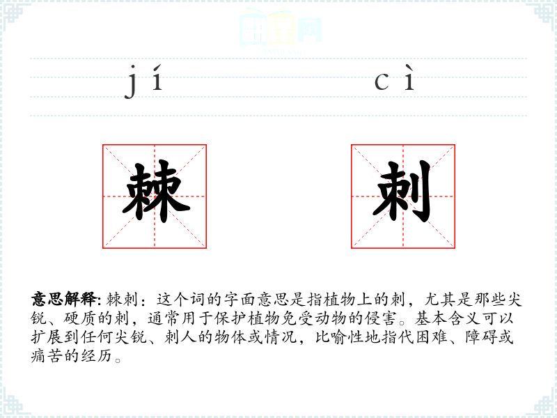 棘刺:这个词的字面意思是指植物上的刺,尤其是那些尖锐、硬质的刺,通常用于保护植物免受动物的侵害。基本含义可以扩展到任何尖锐、刺人的物体或情况,比喻性地指代困难、障碍或痛苦的经历。