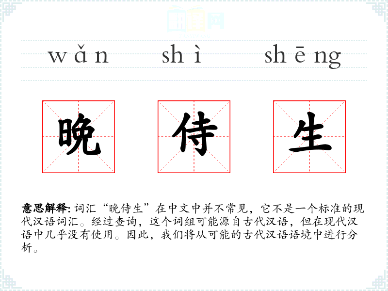 词汇“晚侍生”在中文中并不常见,它不是一个标准的现代汉语词汇。经过查询,这个词组可能源自古代汉语,但在现代汉语中几乎没有使用。因此,我们将从可能的古代汉语语境中进行分析。