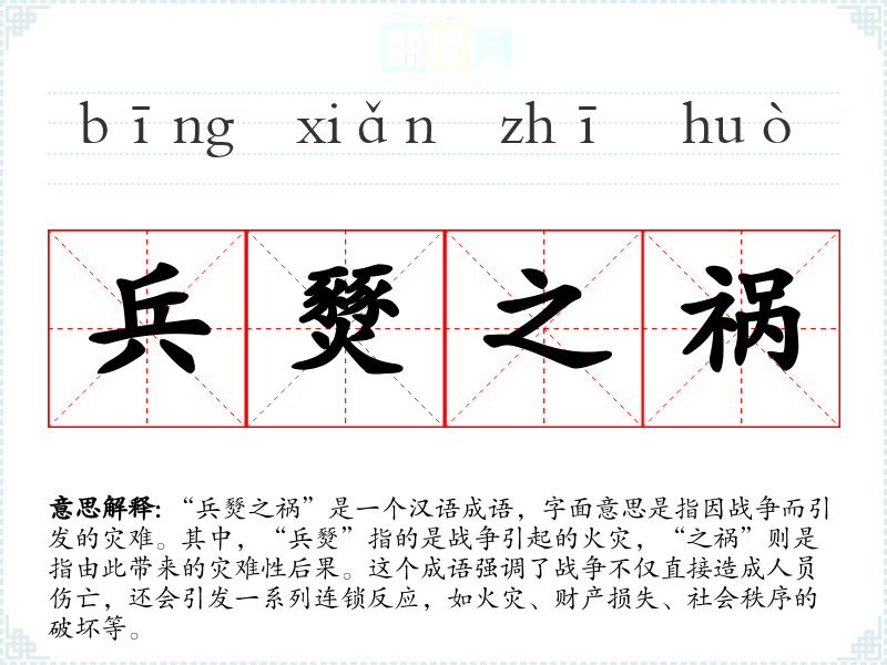 “兵燹之祸”源自古代汉语,其中“兵燹”一词最早见于《左传》等古代文献,用以描述战争中的火灾。随着时间的推移,这个词汇被用来概括战争带来的所有灾难性后果。
