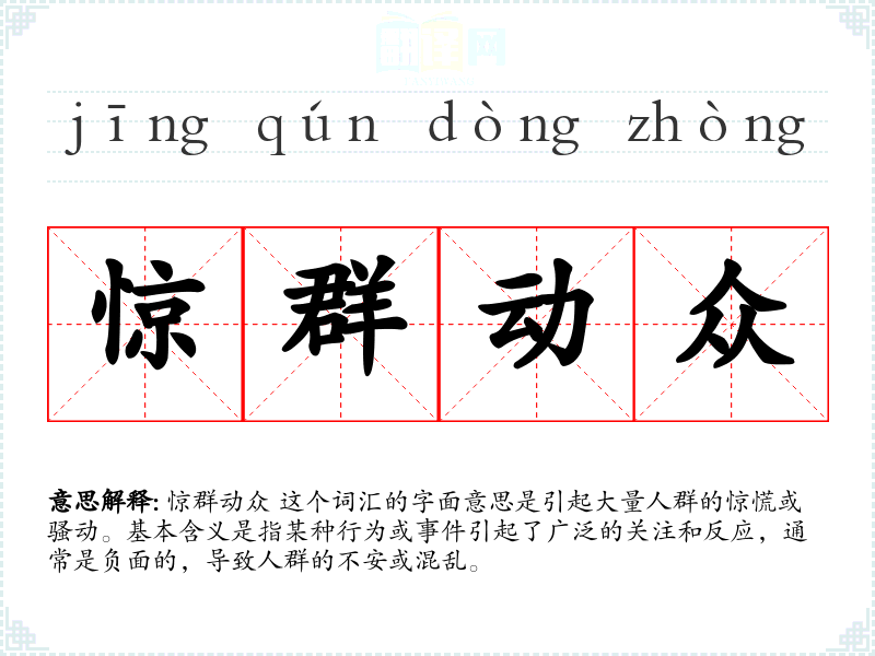 惊群动众 这个词汇的字面意思是引起大量人群的惊慌或骚动。基本含义是指某种行为或**引起了广泛的关注和反应,通常是负面的,导致人群的不安或混乱。