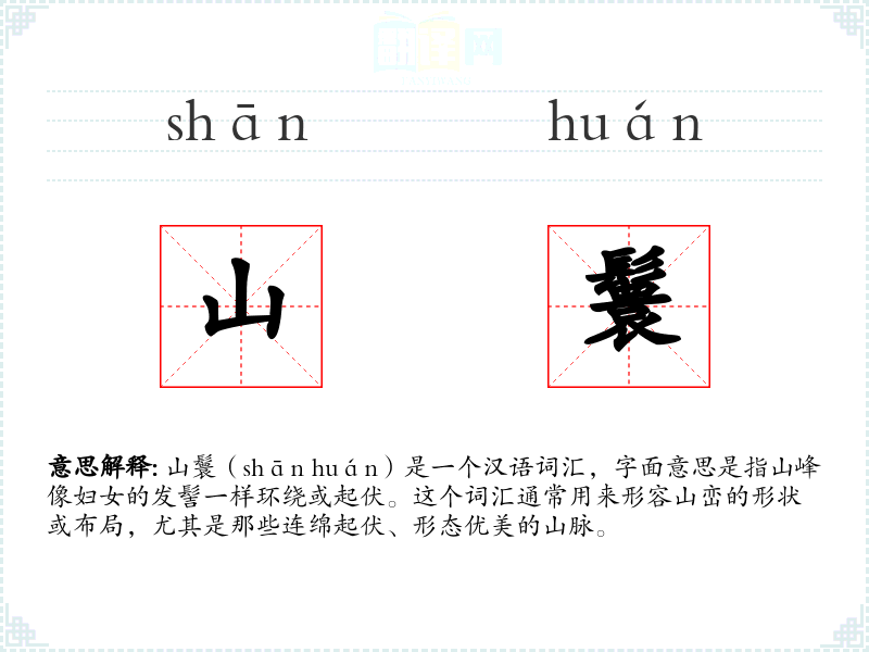 山鬟(shān huán)是一个汉语词汇,字面意思是指山峰像妇女的发髻一样环绕或起伏。这个词汇通常用来形容山峦的形状或布局,尤其是那些连绵起伏、形态优美的山脉。