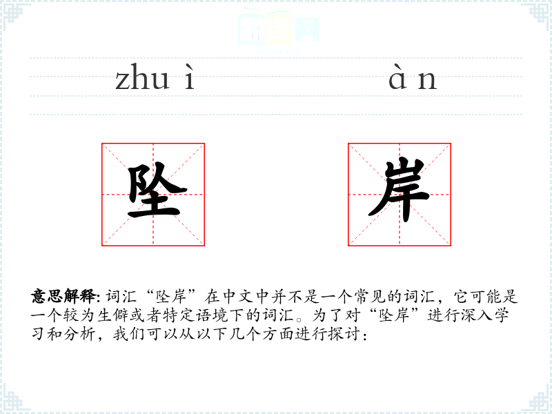 词汇“坠岸”在中文中并不是一个常见的词汇,它可能是一个较为生僻或者特定语境下的词汇。为了对“坠岸”进行深入学*和分析,我们可以从以下几个方面进行探讨:
