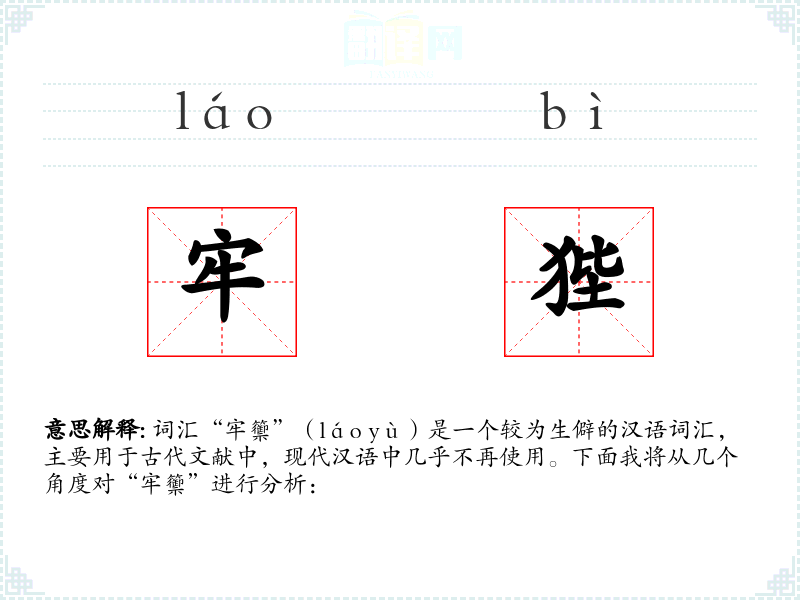 词汇“牢籞”(láo yù)是一个较为生僻的汉语词汇,主要用于古代文献中,现代汉语中几乎不再使用。下面我将从几个角度对“牢籞”进行分析: