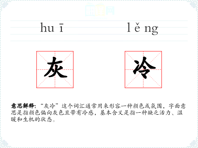 “灰冷”由“灰”和“冷”两个字组成,其中“灰”指颜色,而“冷”指温度或情感上的冷淡。在古代汉语中,“灰”常与“尘”连用,表示尘土飞扬的景象,而“冷”则常用来形容温度低或情感上的冷淡。随着语言的发展,“灰冷”逐渐被用来形容一种特定的氛围或状态。