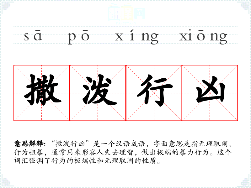 “撒泼行凶”是一个汉语成语,字面意思是指无理取闹、行为粗暴,通常用来形容人失去理智,做出极端的暴力行为。这个词汇强调了行为的极端性和无理取闹的性质。