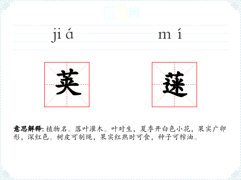 植物名。落叶灌木。叶对生,夏季开白色小花,果实广卵形,深红色。树皮可制绳,果实红熟时可食,种子可榨油。