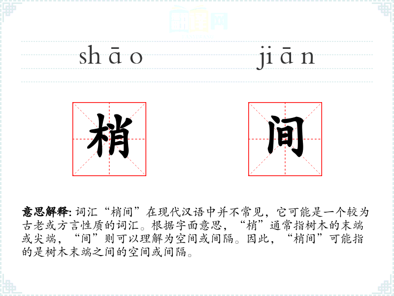 词汇“梢间”在现代汉语中并不常见,它可能是一个较为古老或方言性质的词汇。根据字面意思,“梢”通常指树木的末端或尖端,“间”则可以理解为空间或间隔。因此,“梢间”可能指的是树木末端之间的空间或间隔。