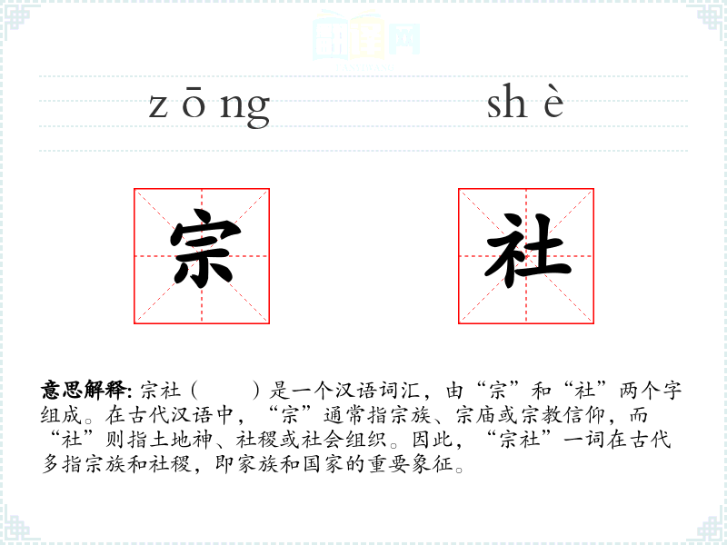 在文学作品中,“宗社”常用来指代家族的根基或国家的根本。在口语中,这个词可能不太常用,但在历史文献或专业领域(如历史学、**学)中,它是一个重要的术语。