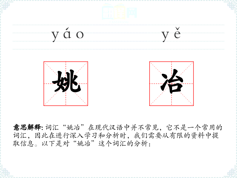 词汇“姚冶”在现代汉语中并不常见,它不是一个常用的词汇,因此在进行深入学*和分析时,我们需要从有限的资料中提取信息。以下是对“姚冶”这个词汇的分析: