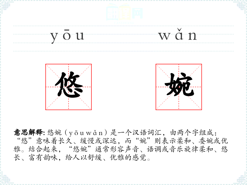 “悠”字最早见于《说文解字》,意为长远。“婉”字则有委婉、柔顺之意,最早见于《诗经》。两个字组合成“悠婉”,在古代文学中已有使用,用以形容声音或语调的柔和与深远。