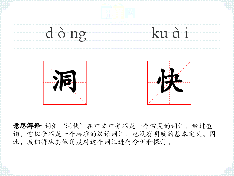 由于“洞快”不是一个标准的汉语词汇,我们无法提供一个确切的基本定义。它可能是某个方言中的词汇,或者是某个特定领域的术语,但没有广泛的认知和使用。