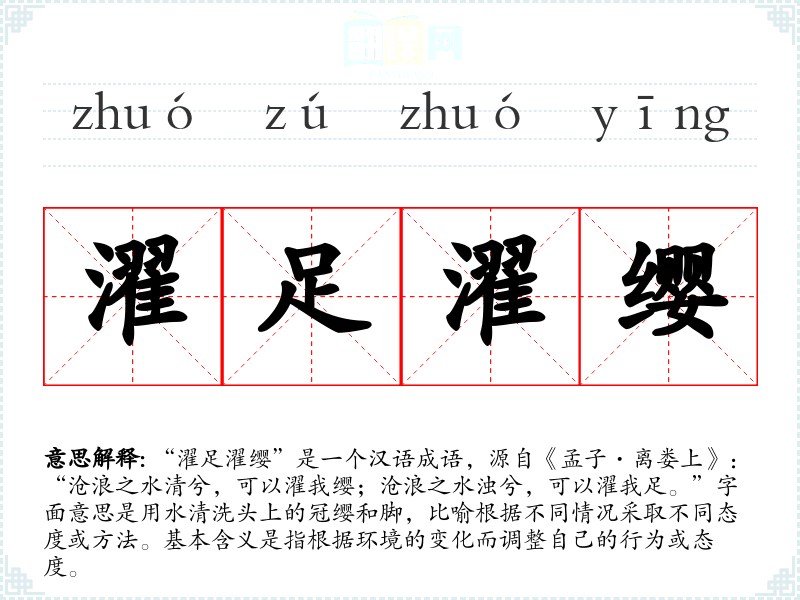 “濯足濯缨”是一个汉语成语,源自《孟子·离娄上》:“沧浪之水清兮,可以濯我缨;沧浪之水浊兮,可以濯我足。”字面意思是用水清洗头上的冠缨和脚,比喻根据不同情况采取不同态度或方法。基本含义是指根据环境的变化而调整自己的行为或态度。