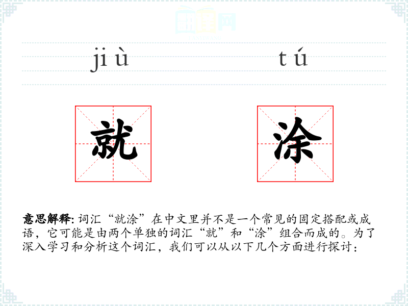 词汇“就涂”在中文里并不是一个常见的固定搭配或成语,它可能是由两个单独的词汇“就”和“涂”组合而成的。为了深入学习和分析这个词汇,我们可以从以下几个方面进行探讨: