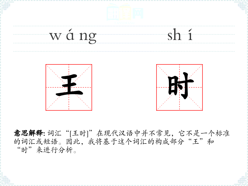 词汇“[王时]”在现代汉语中并不常见,它不是一个标准的词汇或短语。因此,我将基于这个词汇的构成部分“王”和“时”来进行分析。