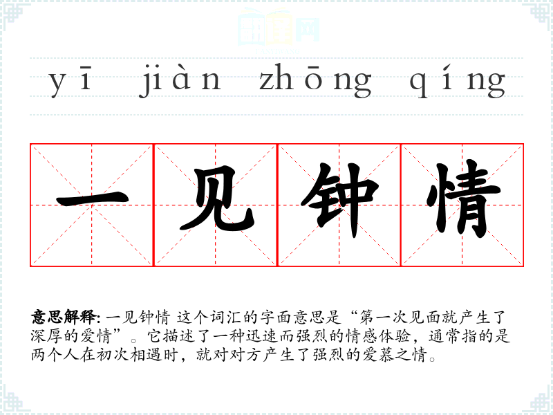 一见钟情 这个词汇的字面意思是“第一次见面就产生了深厚的爱情”。它描述了一种迅速而强烈的情感体验,通常指的是两个人在初次相遇时,就对对方产生了强烈的爱慕之情。