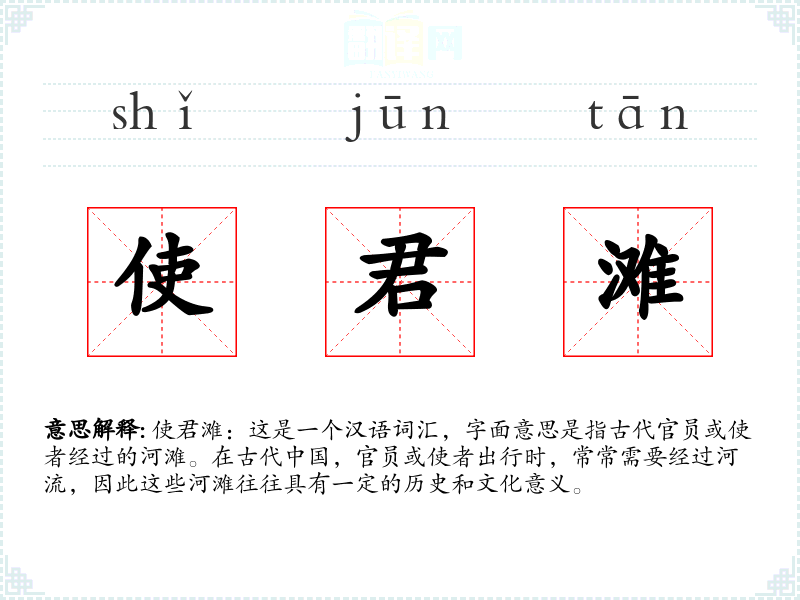 词源:使君滩一词源于古代汉语,其中“使君”指的是官员或使者,“滩”指的是河滩。 演变:随着时间的推移,这个词汇的使用频率可能有所下降,但在特定的历史或文化语境中,仍然具有一定的意义。