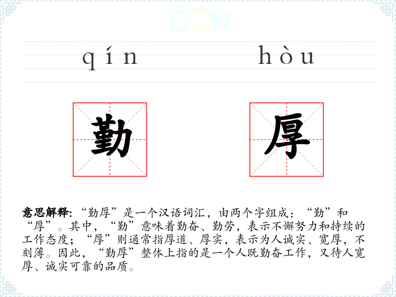 “勤”字最早见于甲骨文,原意为劳作、努力;“厚”字则源于金文,最初指物体的厚度,后引申为人的品质。两个字组合成“勤厚”,强调了人的内外兼修,既有外在的努力,也有内在的品德。