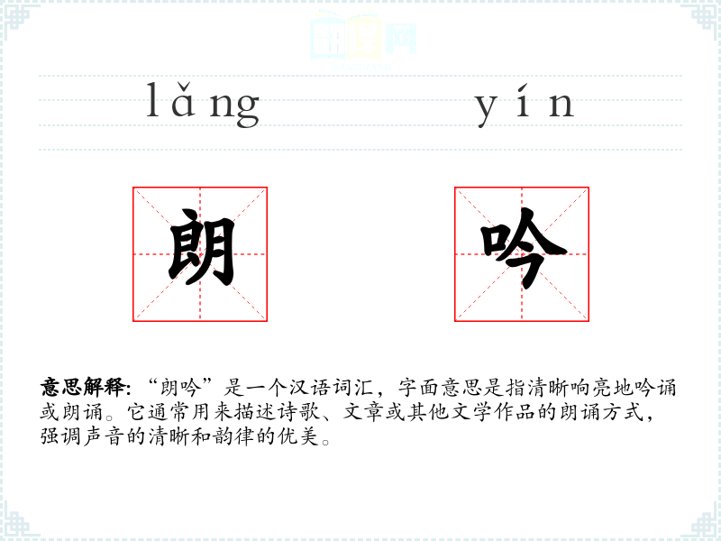 在文学语境中,“朗吟”常用于描述诗人或朗诵者在公众场合或私下里朗诵诗歌的行为。在口语中,它可以指任何形式的清晰响亮的说话或朗诵。在专业领域,如戏剧、演讲和朗诵比赛中,“朗吟”是一个重要的技巧,要求表演者能够准确、有力地传达文本的情感和意义。