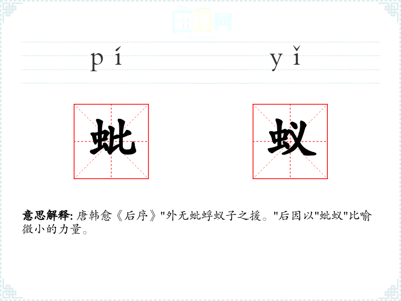 唐韩愈《后序》"外无蚍蜉蚁子之援。"后因以"蚍蚁"比喻微小的力量。