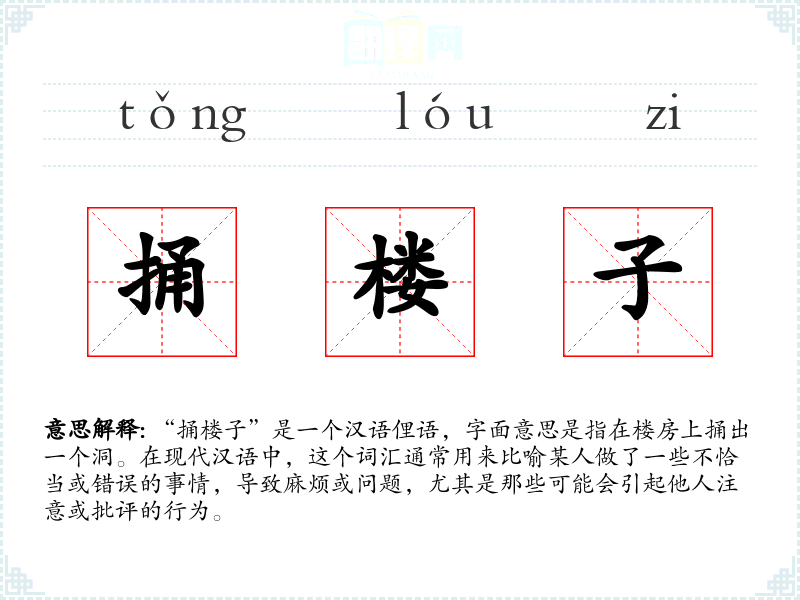 “捅楼子”是一个汉语俚语,字面意思是指在楼房上捅出一个洞。在现代汉语中,这个词汇通常用来比喻某人做了一些不恰当或错误的事情,导致麻烦或问题,尤其是那些可能会引起他人注意或批评的行为。