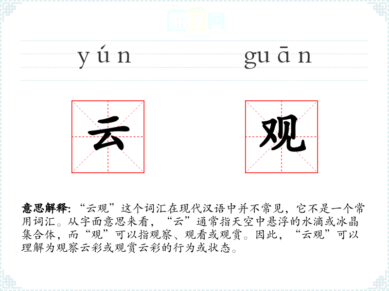 - 反义词:无(由于“云观”不是一个常用词汇,反义词不明显)