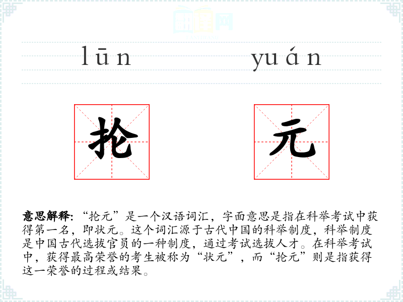 “抡元”是一个汉语词汇,字面意思是指在科举考试中获得第一名,即状元。这个词汇源于古代的科举制度,科举制度是古代选拔官员的一种制度,通过考试选拔人才。在科举考试中,获得最高荣誉的考生被称为“状元”,而“抡元”则是指获得这一荣誉的过程或结果。